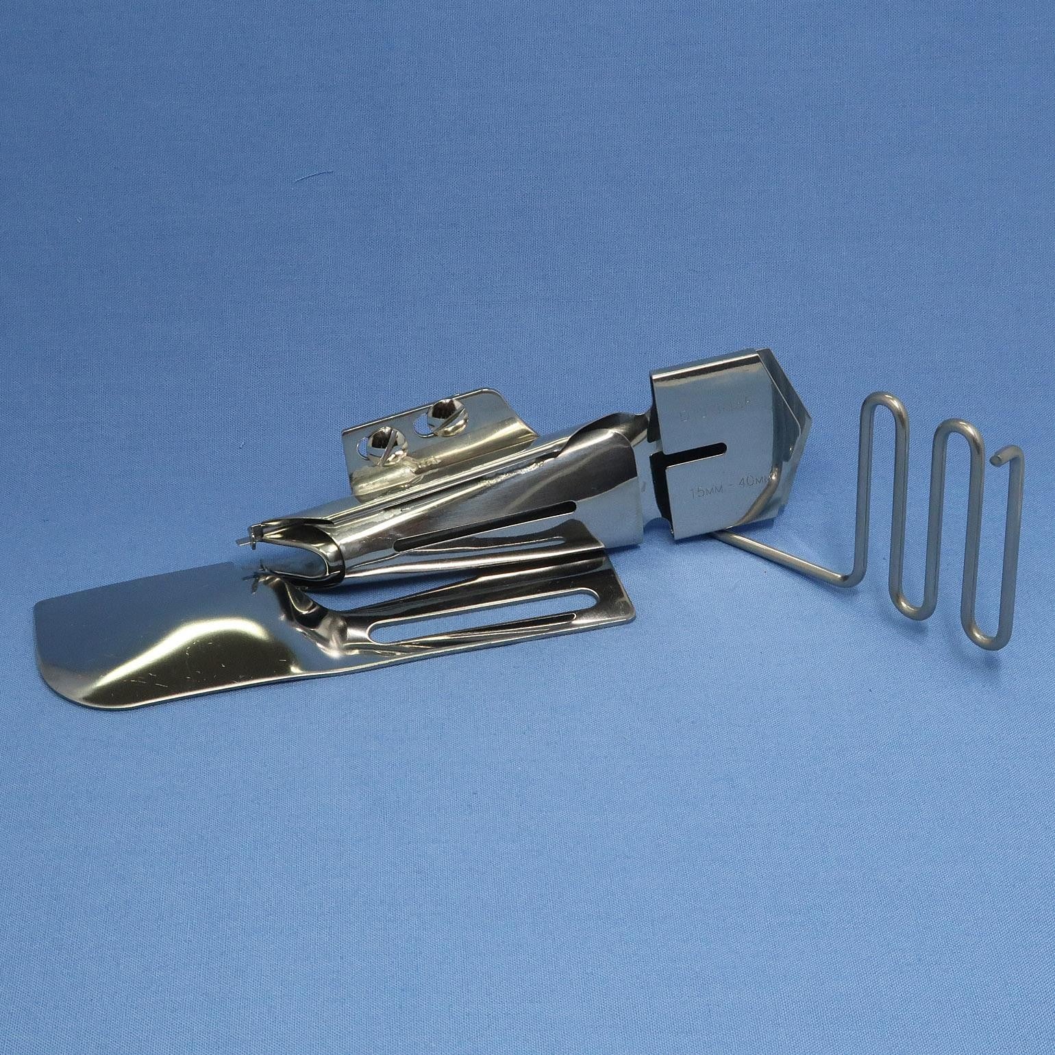 This 12mm Single Fold Knit Binder will turn fabric strips into a double fold on the top side and a single fold on the underside and will attach to your project edge all in one step to give you a professional finish. The single fold will give you a better finish with thicker knits than the double fold. This attachment requires the 4 Hole Flat Bed Table as it attaches to the front two holes of the table (this table is now included with the Gloria and Ovation). It can also be used for woven fabrics – cut on the bias grain of the fabric.