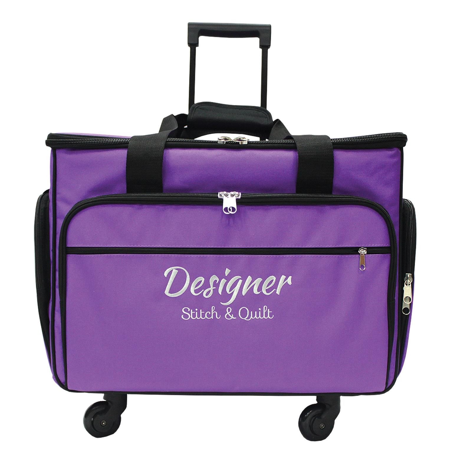 Large Trolley Case from Designer Stitch & Quilt. The 54cm Large Trolley Case is suitable for the Gloria, Ovation, Acclaim and Euphoria Machines. This trolley case features 4 multi-directional swivel wheels, 600 Denier Polyester Fabric, telescopic extension handles, side lifting handles, top carrying handles, two zippered storage pockets on the front and both sides, and an elastic strap for holding the lid open for easier packing.
