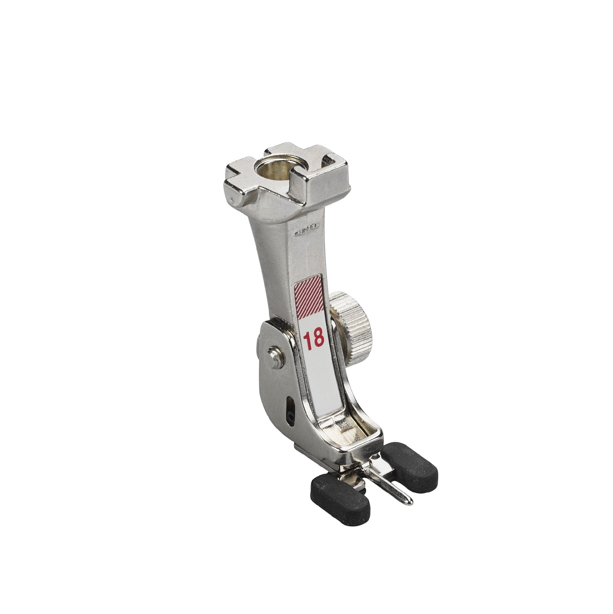 This presser foot helps you sew on buttons and hooks. The rubberised sole holds the button firmly in the right place whilst it is being sewn on. The height of the neck can be flexibly adjusted via the middle toe, depending on the fabric thickness