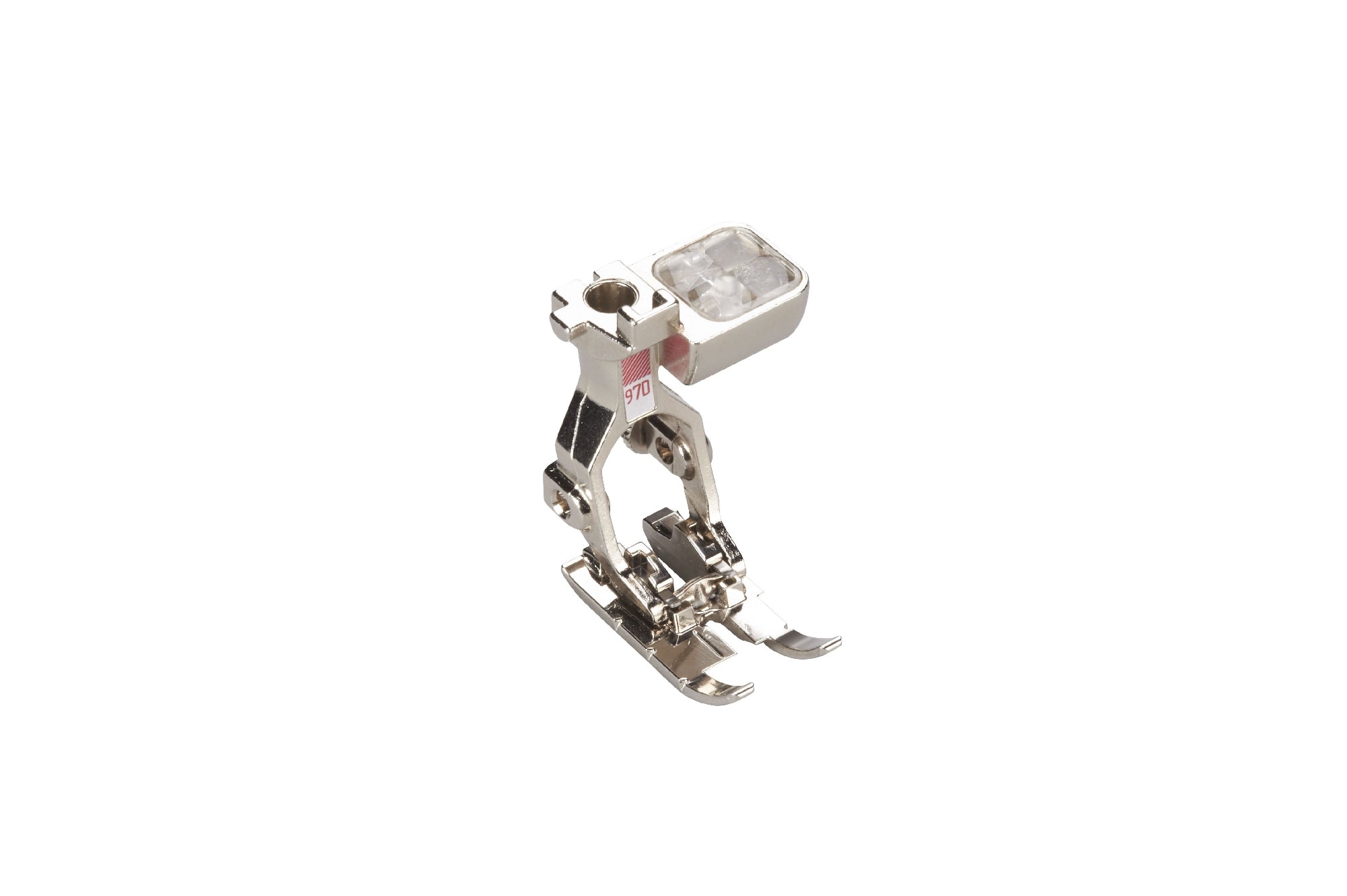 Patchwork foot #97/97D This patchwork foot is ideal for creating beautiful quilts and other precision sewing work. The markings on the sole for seam allowances of 3mm (1/8“), 6mm (¼“) and 7.5mm (3/10“) ensure accurate guiding. The contact area of this foot is perfect for machines with a 9mm stitch width, and enables careful guiding of the fabric and stitching when joining