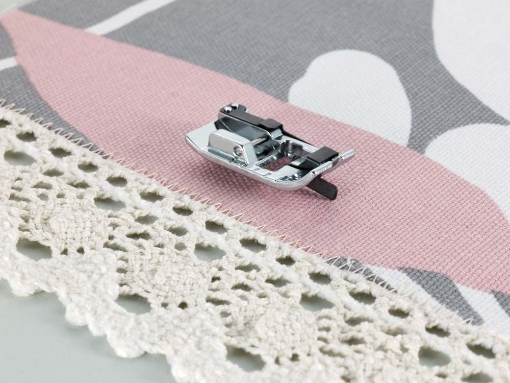 Attaching lace and joining fabrics is a cinch when you use the Edge Joining Foot. With a centre guide to help you position the fabric.