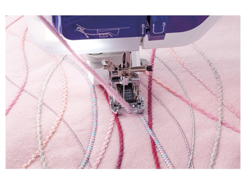 Enjoy creating fabric surface embellishments using yarn and decorative cords with this easy to use, dual feed couching foot. The included yarn threader helps feed your yarn to the couching foot with ease, included yarn guides help make this technique quick and easy. Suitable for use with XP, XV, V, and BQ series machines.