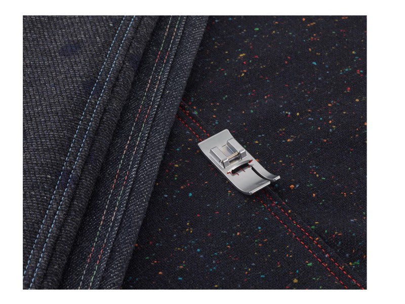 Used for finishing seams by topstitching seam allowances of thick materials (like wool, denim or tweed) folded over to one side. Three position markings help to easily find where to drop the needle and the longer curved shape can hold cloth for better feeding avoiding getting stuck to cloth.