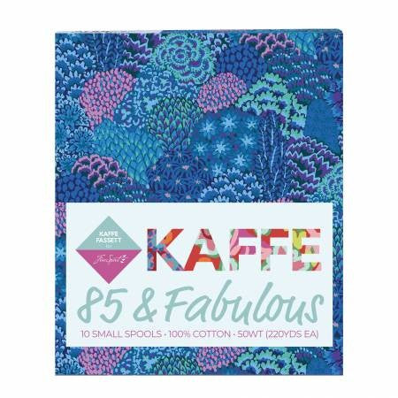 Kaffe Fassett has inspired people across the world with his colorful work in fabric, knitting, needlepoint, patchwork, painting, and mosaic. He is an industry icon, a design hero, and in this, his 85th year, we celebrate his work. 85 & Fabulous is a collection of 10 small spools of 50wt threads in all of Kaffe’s go-to hues, made to perfectly complement his celebratory Free Spirit Fabrics collection.