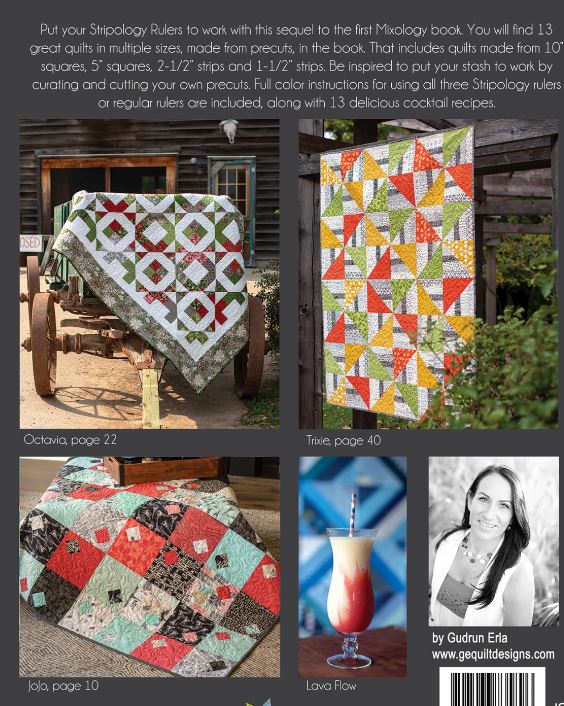 Put your Stripology Rulers to work with this sequel to the first Mixology book. You will find 13 great quilts in multiple sizes, made from Precuts. That includes quilts made from 10in squares, 5in squares, 2-1/2in strips and 1-1/2in strips. Be inspired to put your stash to work by curating and cutting your own precuts. Full color instructions for using all three Stripology rulers or regular rulers are included in the 84 page book, along with 13 delicious cocktail recipes.
