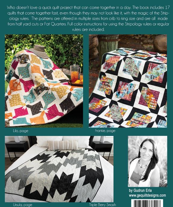 Who doesn't love a quick quilt project that can come together in a day? The book includes 17 quilts that come together fast, even though they may not look like it, with the magic of Stripology® Rulers. The patterns are offered in multiple sizes from crib to king and are all made from half yard cuts or fat quarters. Full color instructions using the Stripology Rulers or regular rulers are included.