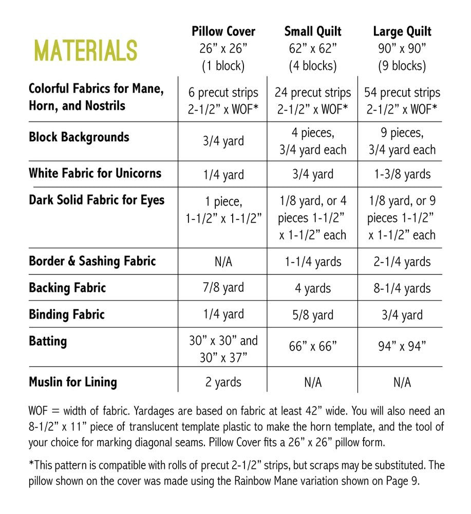 Use precut 2-1/2” fabric strips and conventional patchwork piecing techniques to make these magical unicorn blocks for two quilt sizes and a floor pillow. Most of the project is sewn similar to my other patterns, with simple straight and diagonal seams. The horn is made using a single template-cut piece that is sewn using a simple slice and insert method.