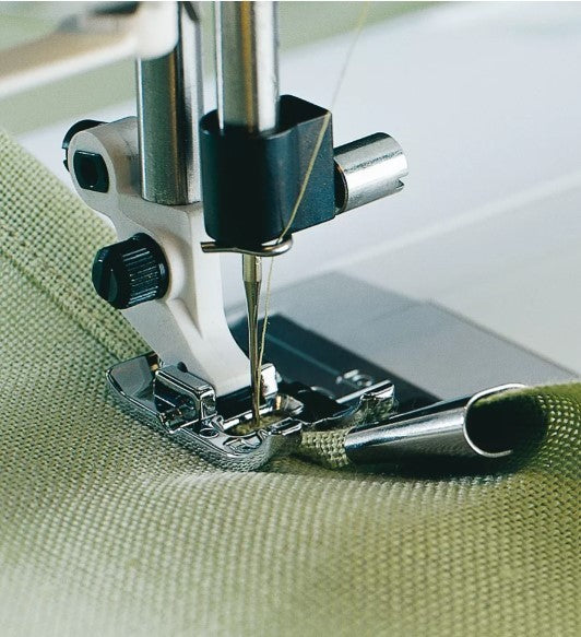 Rolls a 10 mm double hem in light to medium weight fabrics.