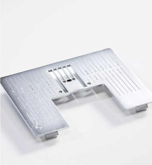 The Straight Stitch Needle Plate guarantees even fabric feed at the beginning and end of a seam while preventing the fabric from being pulled into the needle plate.