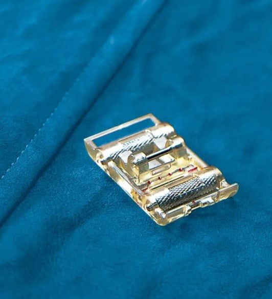 This special presser foot has two metal rollers, making it a good choice for sewing and decorating fabrics that don‘t feed well