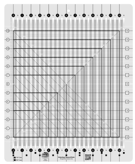 The Stripology® Squared Ruler designed by Gudrun Erla from GE Designs for Creative Grids® helps you square up blocks up to 12-1/2in.