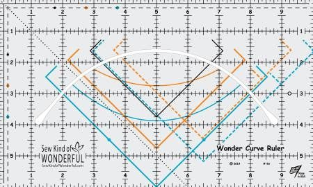 This 6in x 10in piecing ruler has colored lines and markings which makes it wonderfully simple to make a combination of curved blocks which are used repeatedly in WCR Patterns! These unique lines and markings make using the Wonder Curve Ruler easy as, 1-2-3! The three bold colored lines also make it easy to scale a block larger or smaller just by aligning fabric with the different colors and marks.