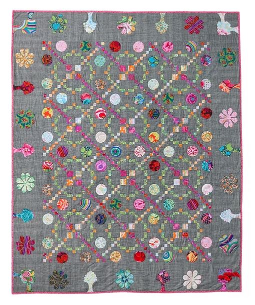 So enjoyable was the process of quilting the original, that this second version was born – beginning with a dramatic black background that seemed to magnetically attract a vibrant Kaffe Fassett fabric stash. Against the deep black, the saturated colours glow and flash, creating extraordinary contrast and movement across the quilt. Extra appliquéd circles add playful positives and negatives around the circular piecing within each block, enhancing the dynamic visual effect.