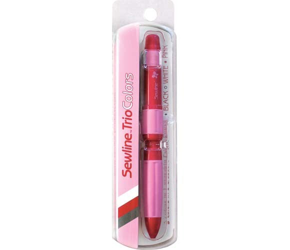 Trio Colors comes with 3 coloured lead pencil points – white, pink and black. Just turn the barrel to select your colour. The ceramic leads glide smoothly over fabric, leaving a nice clean line with no chalky residue. The special grip means it’s comfortable to use with good control. When you wish to remove the marks, simply use a polymer eraser ( there is a small one under the lid) or the Sewline Aqua eraser.