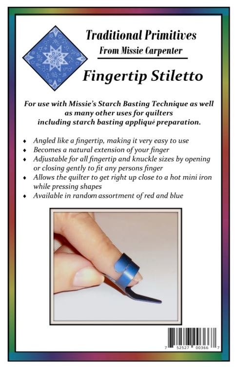 This tool is awesome for preparing English Paper Piecing (or Applique') with starch and Premium Freezer Paper. It saves your fingertip and fingernail from the hot iron. Due to the angle of the tip, it becomes a natural extension of your finger, helping you handle your pieces with ease. It is adjustable to fit any size or shape finger. It also works great to offer finger protection when using a sewing machine by keeping your fingertip away from moving needles or moving parts. Another way to use it is to open seam allowances and follow the stiletto with the iron while holding the seams open. This is a notion you can not do without!